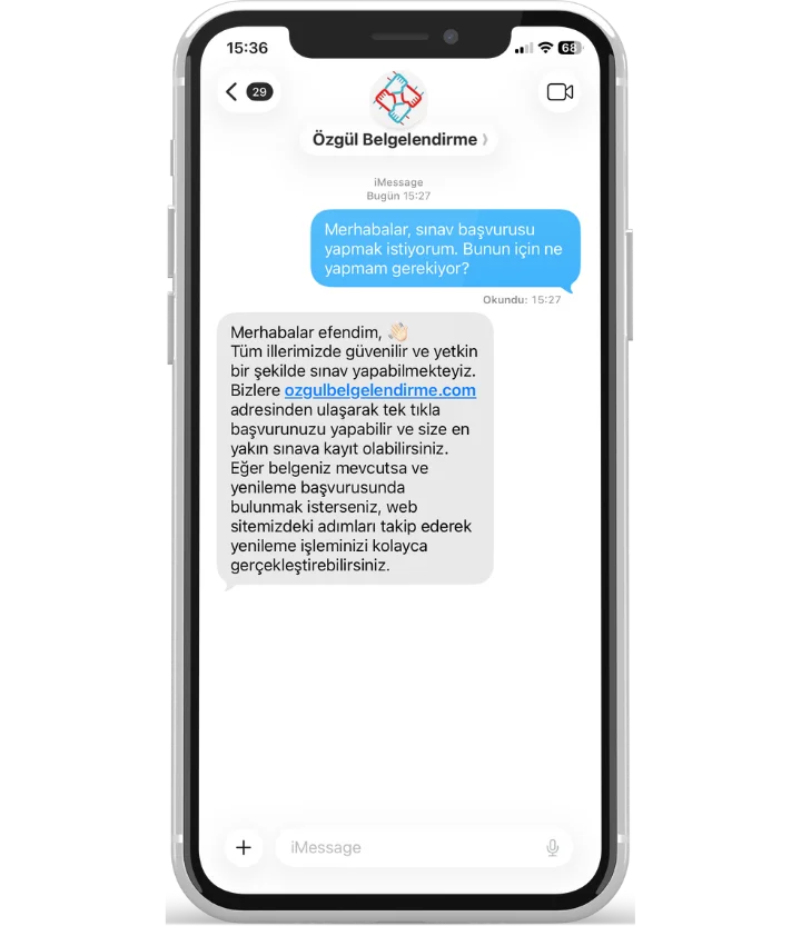 belgelendirme süreçlerinizin her adımında yanınızda olarak tüm sorularınıza anında yanıt verir ve kesintisiz iletişim ile sizi bilgilendirir. Bu sayede operasyonel verimliliğinizi artırarak hedeflerinize güvenle ulaşmanızı sağlıyoruz.